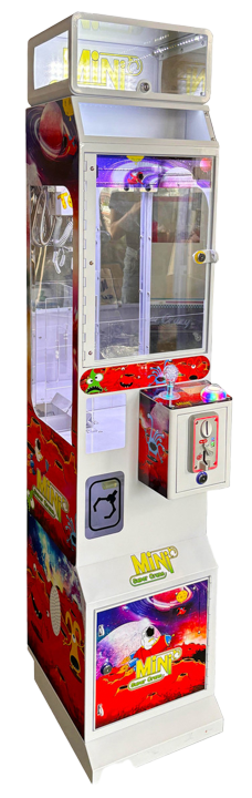 It is an amazing compact version of the full sized claw machine. These innovated machines have a small footprint (14”w x 13”d x 65”h) and are remarkable energy efficient. They can be put side-by-side or stand alone in different locations; just about anywhere there is a plug- in available.